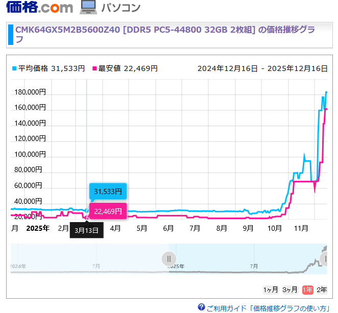 タイトルの通り、世界的にAI需要が大きくなってきたため、ドミノ倒しのように自作PC系のメモリも高くなってきてるよと聞いてはいたのですが、調べてみたらすごかった。3月にPCを新調したのでその時に買ったメモリをカカクコムで調べてみました。